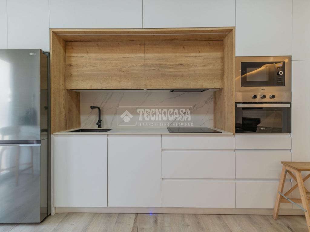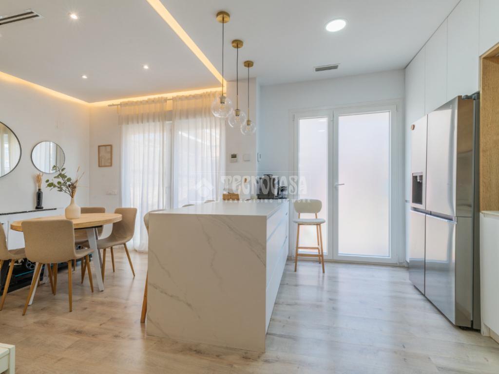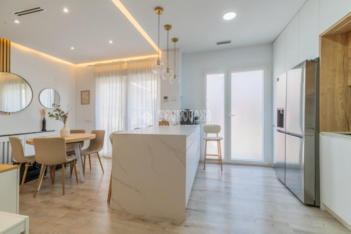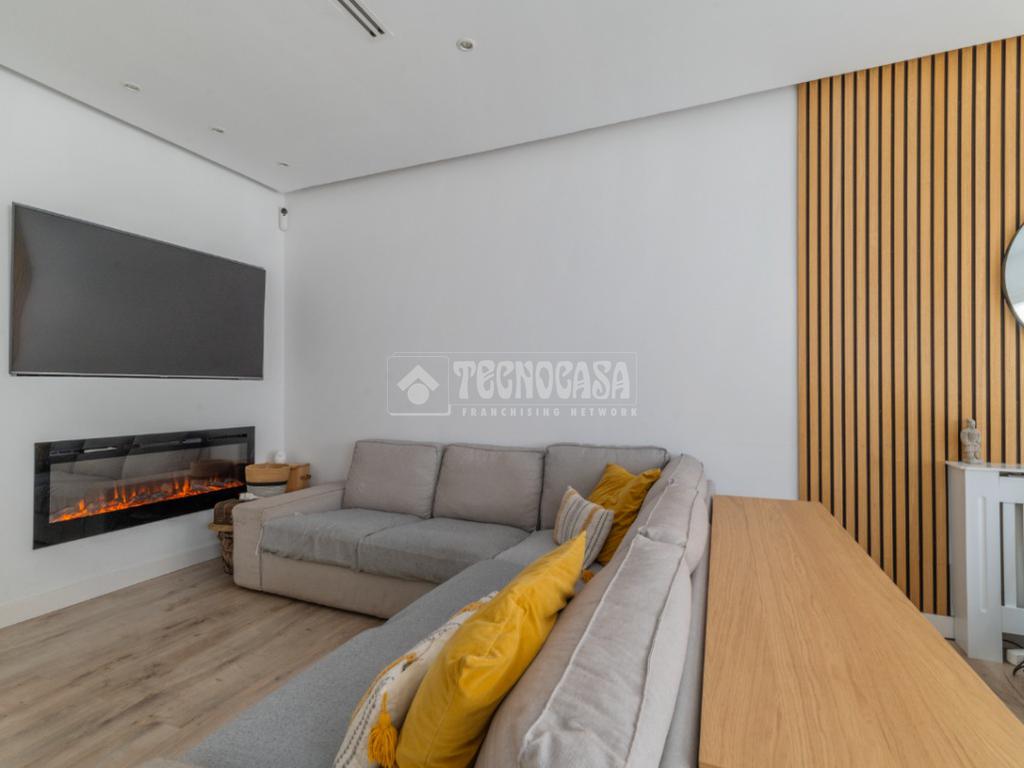 El gran salón, con una moderna cocina americana, se ilumina con luz perimetral indirecta, creando un ambiente acogedor. Las persianas del salón son domotizadas, lo que añade un toque de tecnología a tu día a día. Además, el aire acondicionado y la calefacción de gas natural garantizan el confort en cualquier época del año.